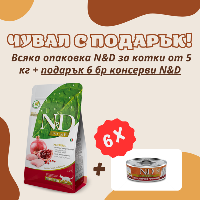 €5.06 / 9.90 лв.N&D Cat Prime Chicken Adult Neutered храна за кастрирани котки с пилешко месо и нар