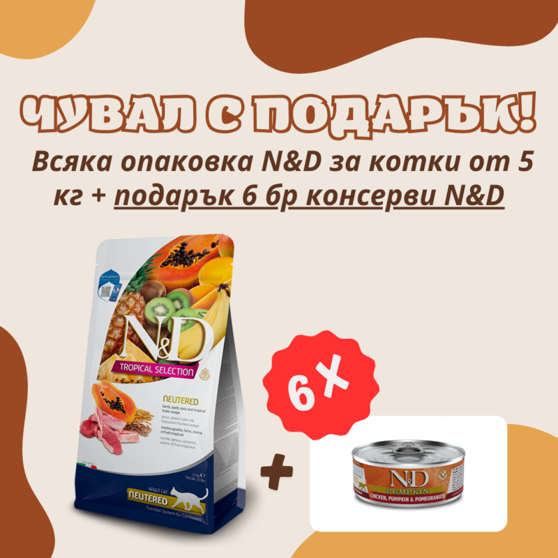 €5.06 / 9.90 лв.N&D Cat Adult Tropical Selection Neutered Lamb and Tropical Fruits суха храна за кастрирани котки с агнешко, спелта, овес и тропически плодове
