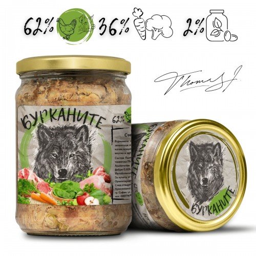 Бурканите са ежедневна храна за домашни любимци. Приготвени са от месо, зеленчуци и хранителни добавки. Готви се в буркан чрез стерилизация. По този начин всички полезни вещества остават в буркана, което прави менюто питателно, вкусно и здравословно. Натурална храна без консерванти, овкусители и оцветители.