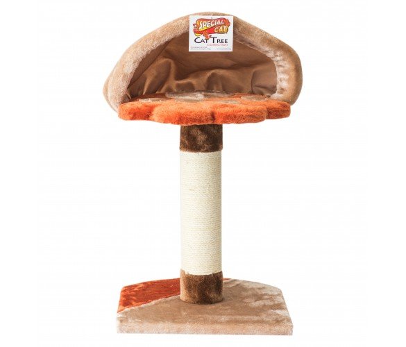 Красив занимателен кът за котки, състоящ се от здрава основа, облечена с плюшена дамаска; прът, обвит със сезал – идеален за острене на нокти и второ ниво за катерене, с комфортно легло за почивка.