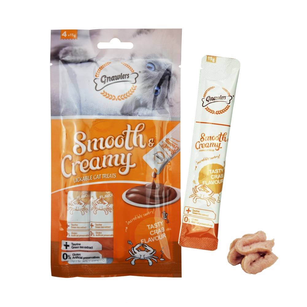 GNAWLERS Smooth and Creamy – кремообразно лакомство за котки, с четири уникални вкуса – СЬОМГА, МОРСКИ РАК, МИДИ И ПИЛЕ С ДРОБ 4×15 гр. Комбинира в себе си гладка текстура и невероятен вкус на сьомга, за да задоволи и най-капризните котки.