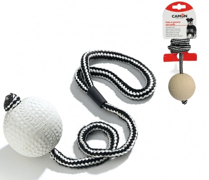 Мека гумена топка с въже подходящо за обучение на кучето. Диаметър: 7см. Дължина: 60см.