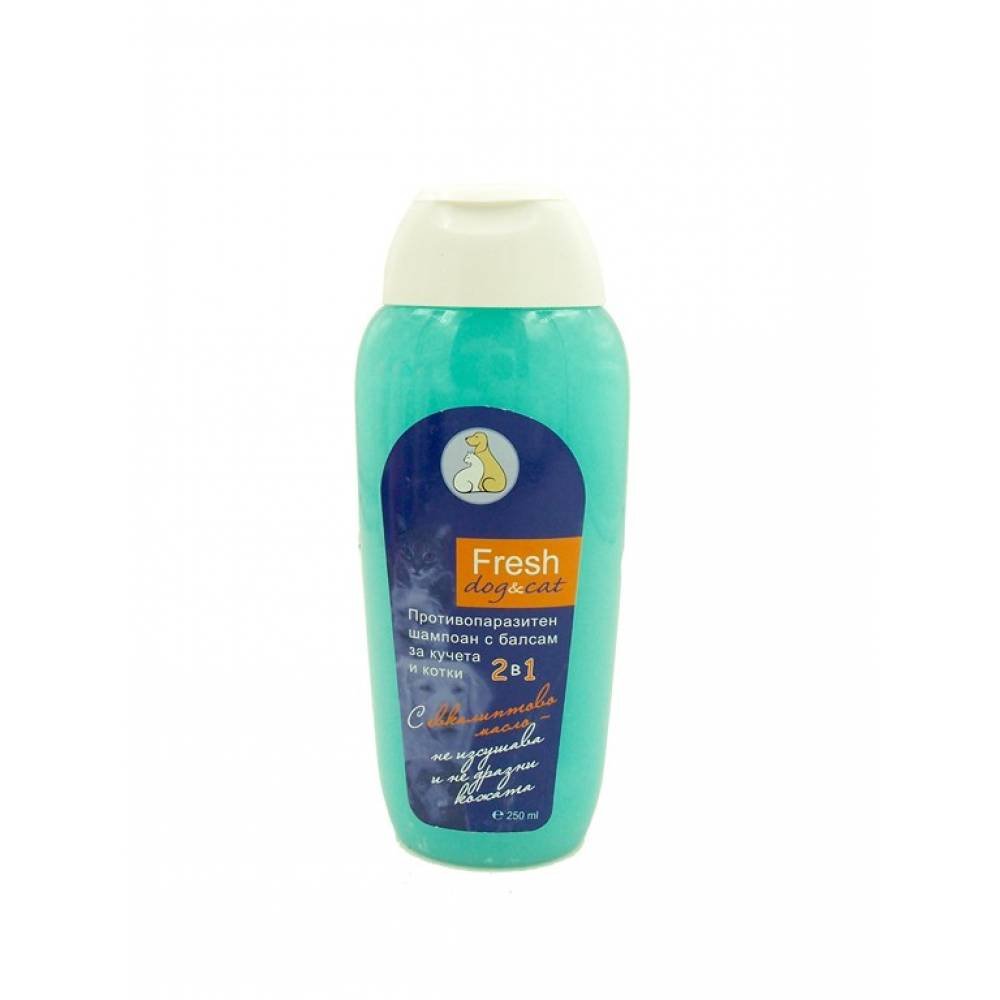 Противопаразитния шампоан Fresh с евкалиптово масло, е разработен на основата на целулозна структура и добра комбинация от меки пенители. Подходящ е за честа употреба, и е предназначен и за кучета и за котки. Шампоанът не изсушава и не дразни кожата на домашните любимци поради липсата на сол или други видове електролити. Създава фина и плътна пяна.