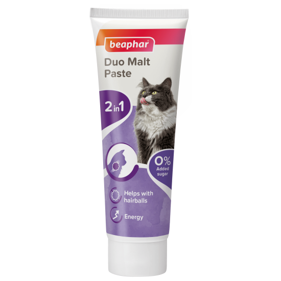 Beaphar Дуо малцовата паста е средство против образуване на топки косми в стомаха, което комбинира 2 действия в 1 туба. Стандартните малцови пасти действат основно за предотвратяване на образуването на топки косми в стомаха на котката. При по-нататъшното изхвърляне на космите обаче могат да се появят чревни проблеми. Ето защо Beaphar Duo-Malt paste има 2 функции: