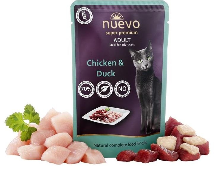 Nuevo пауч с пиле и патица съдържа 72% прясно пилешко и патешко месо, комбинирано с висококачествено масло от сьомга за оптимално ниво на омега 3 и омега 6 мастни киселини. Най-добрият вкус заради пресните му съставки ще задоволи дори и придирчивата котка!
