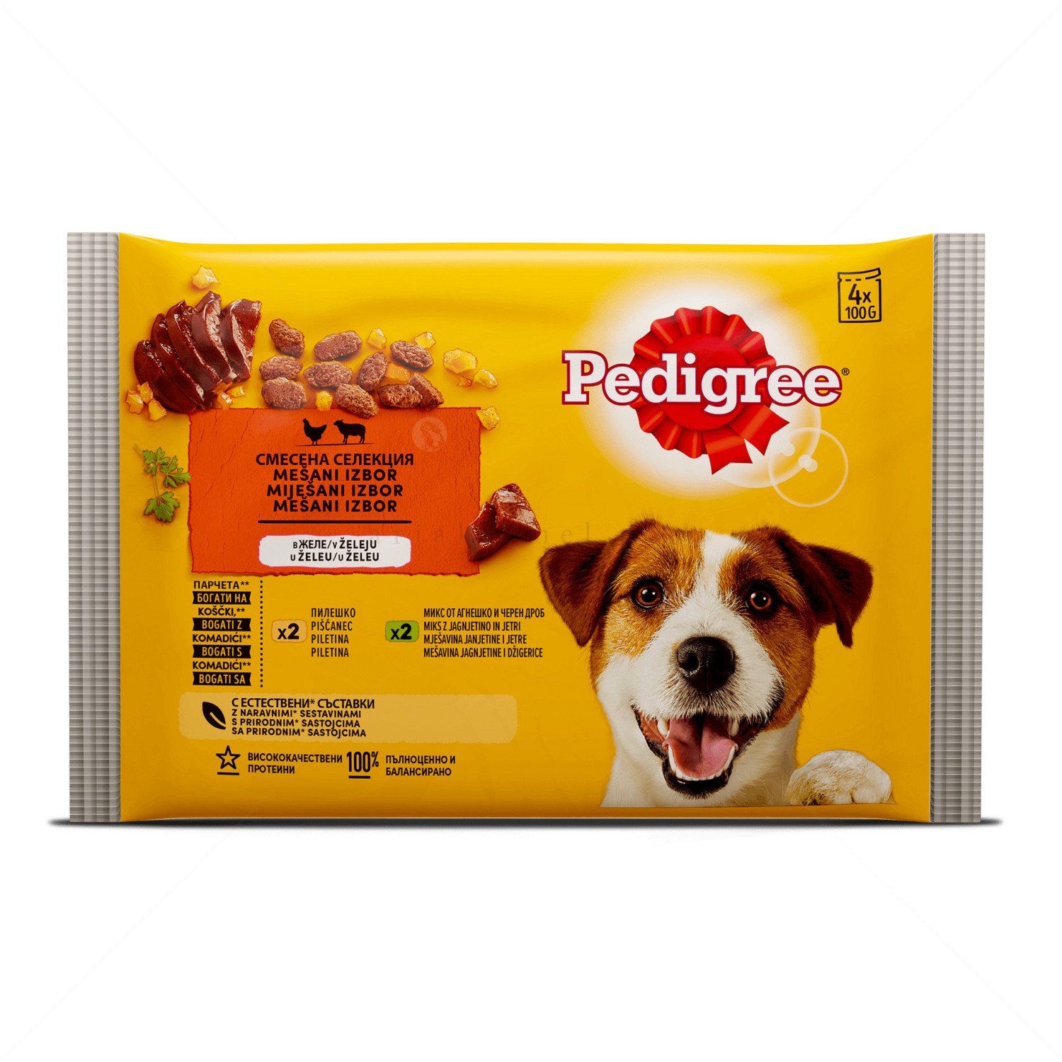 Pedigree® пауч осигурява 100% хранително балансирано решение за Вашето куче. Всяка вкусна порция съдържа изключително важни съставки, от които вашето куче има нужда за здрав и щастлив живот. Съдържа естествени фибри за контрол на теглото и добро храносмилане, и добавен калции – за здрави кости и стави. Цинк и слънчогледово масло за лъскава козина и здрава кожа. Витамин Е и минерали за стабилна имунна система. Без изкуствени оцветители, овкусители, консерванти или добавена захар. Практична опаковка, подходяща за едно ястие на малко или средно куче или при смесено хранене в комбинация със суха храна.