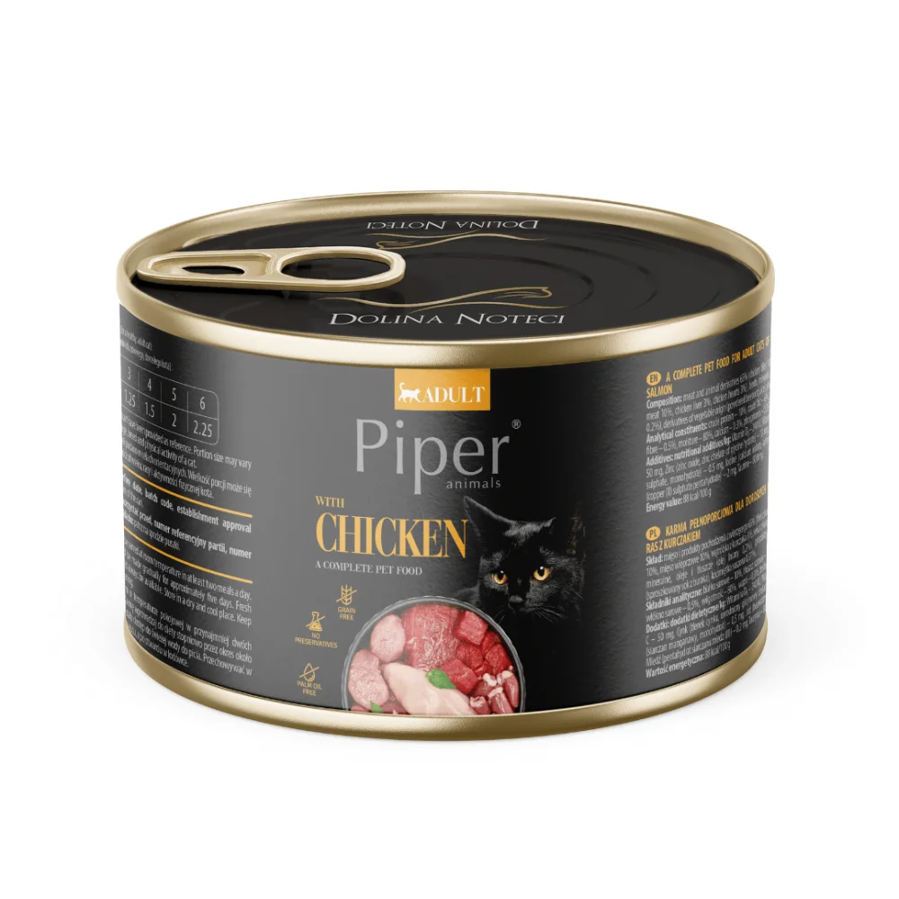 Тази храна за домашни любимци с пилешко месо е балансирана по отношение на хранителното си съдържание въз основа на настоящите норми и препоръки за хранене. Освен високото съдържание на протеини, пилешкото месо доставя мазнини с богато съдържание на мастни киселини, както от n-6, така и от n-3 групи. EPA и DHA мастните киселини са особено важни, тъй като играят роля в процесите, защитаващи нервната тъкан и в репродукцията. Piper Cat с пилешко месо осигурява поддържането на правилната минерализация на костите и зъбите и спомага за поддържането на правилното функциониране на метаболитните процеси.