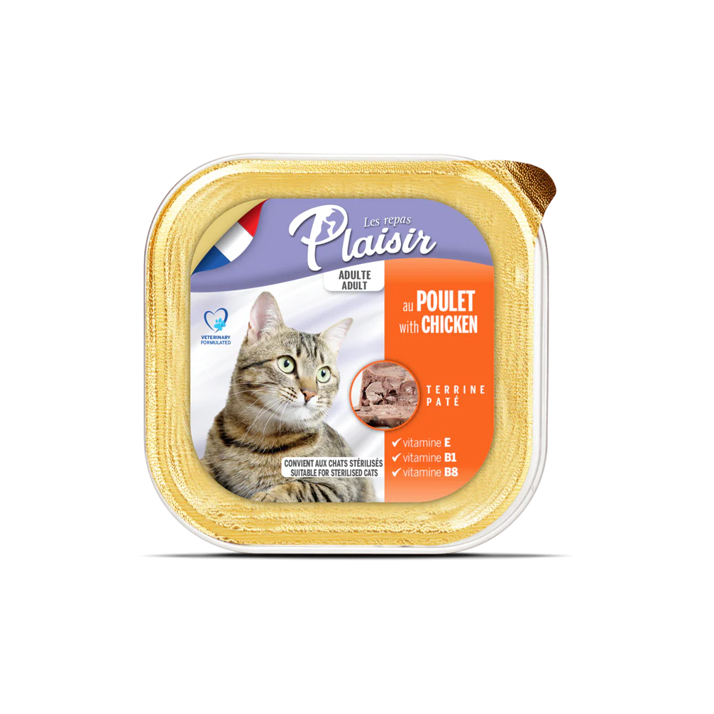 Пастетите Plaisir с пиле са пълноценни ястия и се предлагат под формата на меки терини с парченца. Нивото им на протеин е 10%, което е отлично за задоволяване на хранителните нужди на вашето малко месоядно животно. Те са подходящи за стерилизирани възрастни котки. Вашата котка ще ги оцени.