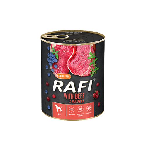 Консервираната храна от говеждо месо Rafi се характеризира с високо съдържание на пълноценен протеин и с ниско съдържание на мазнини. Освен това месото и суровините, получени от говеждо месо, са ценен източник на лизин и хистидин. Важни вещества са също мастните киселини от семействата n-3 и n-6, регулиращи работата на много жизнени функции на възрастните кучета. Храната съдържа желязо, което осигурява правилния метаболизъм на кръвта, както и селен и цинк, покриващи дневните нужди от тези съставки. Рецептата е обогатена с добавянето на червени и черни боровинки, които благодарение на присъстващите в тях биологично активни съединения, главно процианидини и флавоноиди, имат силни антиоксидантни и противовъзпалителни свойства. Мащерката от своя страна има антибактериален ефект и има положителен ефект върху храносмилателните функции.