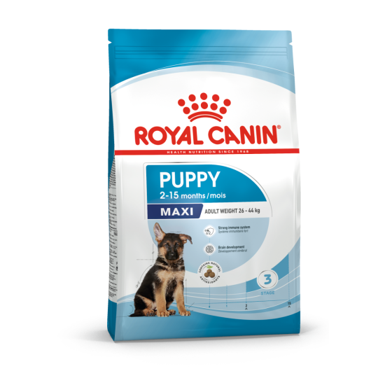 ROYAL CANIN® Maxi Puppy е специално формулирана за хранителните нужди на вашето подрастващо куче от едра порода. Тази храна е подходяща за кученца от едри породи от 2 до 15 месеца, които ще достигнат тегло в зряла възраст от 26 до 44 кг. Тази адаптирана храна съдържа хранителни вещества като витамин С и Е, които доказано подпомагат развитието на здравата имунна система на кученцето. Обогатен е с омега-3 мастни киселини (като DHA), за които научни доказателства свидетелстват, че подпомагат здравословното развитие на мозъка при кученцата. Комбинация от полезни пребиотици (като фрукто и мано-олигозахариди и пулп от цвекло) и лесно смилаеми протеини спомагат за поддържането на здравословен баланс на чревната микробиота (чревна флора) за добро храносмилане. Формулата също така съдържа оптимално енергийно съдържание, предназначено да задоволи енергийните нужди на растящите кученца от едри породи. Гранулата на ROYAL CANIN® Maxi Puppy е специално проектирана за уникалните нужди на кученцата от големи породи. Нейният размер и форма помагат да се регулира скоростта, с която вашето кученце яде и допринасят за усещането за ситост. Механичният ефект на четкане, докато вашето кученце дъвче, помага за поддържане на денталното здраве. Когато вашето кученце навърши 15 месеца, то ще се нуждае от храна, която е специално адаптирана, за да отговори на нуждите му като пораснало куче. На този етап можете да преминете към формулата ROYAL CANIN® Maxi Adult.
