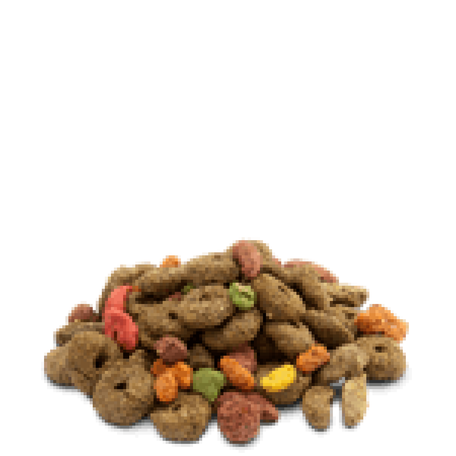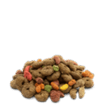 Състав: пшеничен фураж, люспи от лимец, пшеница, люцерна, пшеничен прах, натрошена царевица, протеинов концентрат от люцерна, фураж от пшеничен глутен, брашно от слънчогледово семе, ленено семе, натрошен грах, овесени люспи, калциев магнезиев карбонат, соеви люспи, царевица, натриев хлорид, рафиниран кокос масло, фрукто-олигозахариди, монокалциев фосфат, препечени соеви зърна, сушени моркови, чесън, риган, мащерка, майорана, соев шрот, мента, куркума
