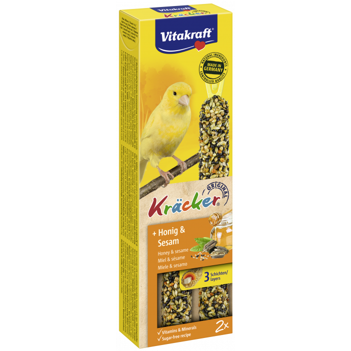 Крекерите на Vitakraft® (Kräcker® e запазена марка на Vitakraft®) са едновременно истински вкусни и много занимателни, подтиквайки канарчетата сами да заработват храната си чрез присъщи за тях дейности. Три вкусни, изпечени върху естествено дърво слоя предлагат изключително дълго удоволствие, докато птицата кълве и добива храната си, и подпомагащи грижата за човката.