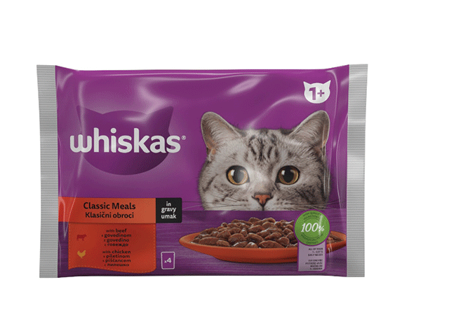 Whiskas Classic Meals паучове за котки пилешко и говеждо в сос грейви, 4х85 гр.