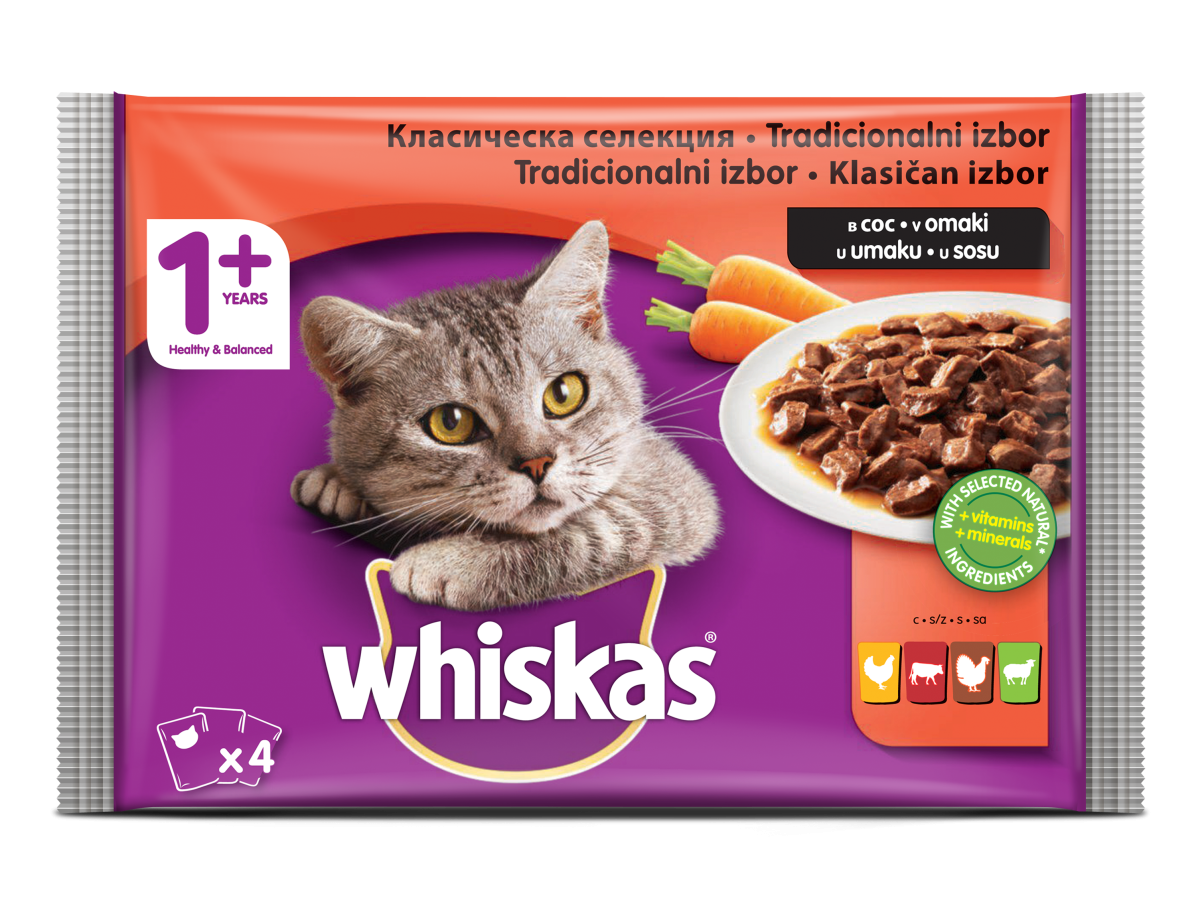 Whiskas Adult Cat Pouch, месни ястия и зелнечуци, 4х100 гр